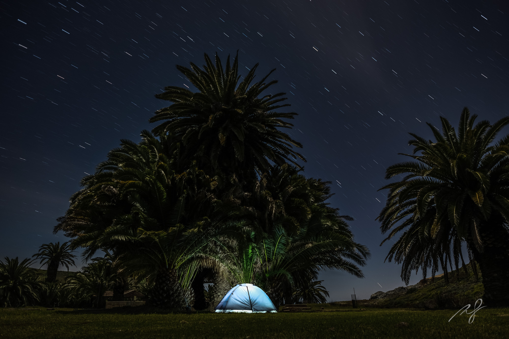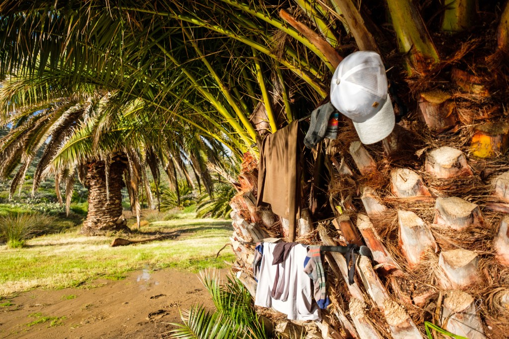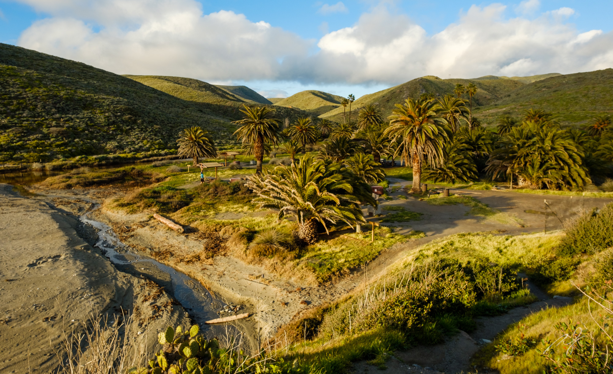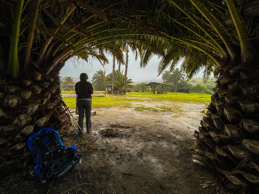 With the skies cleared out, we started to explore the area, and wow, what a stunning place! We never saw another person that evening. We were totally alone. So, we decided, with the potential for more weather coming, to set up our tent under the grove of palms.